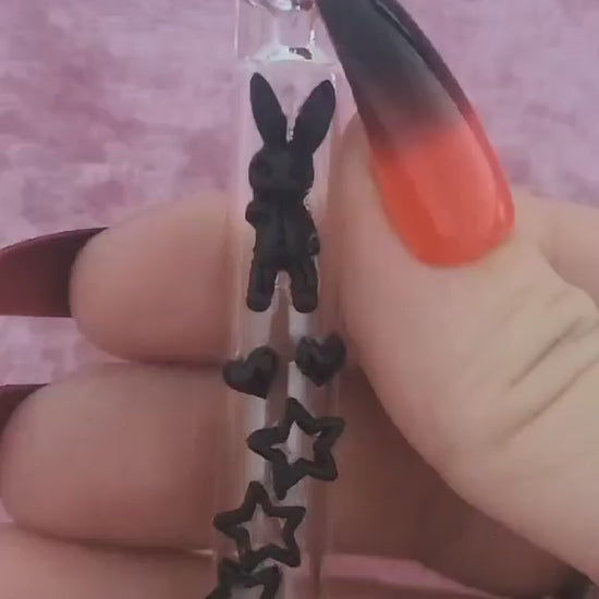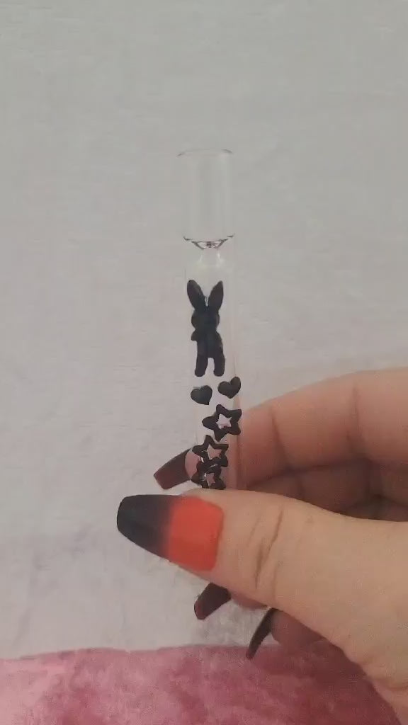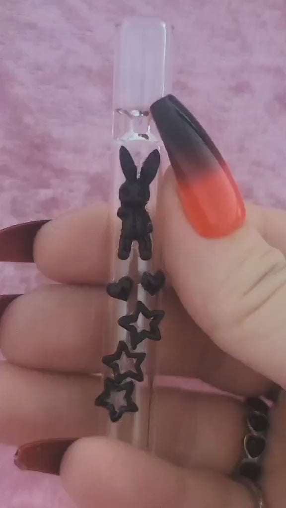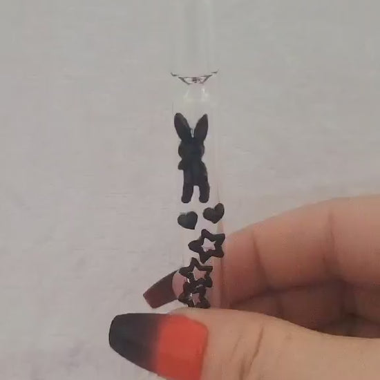 Handmade glass chillum with a black bunny, hearts, and stars design. Cute, gothic, and celestial vibes.